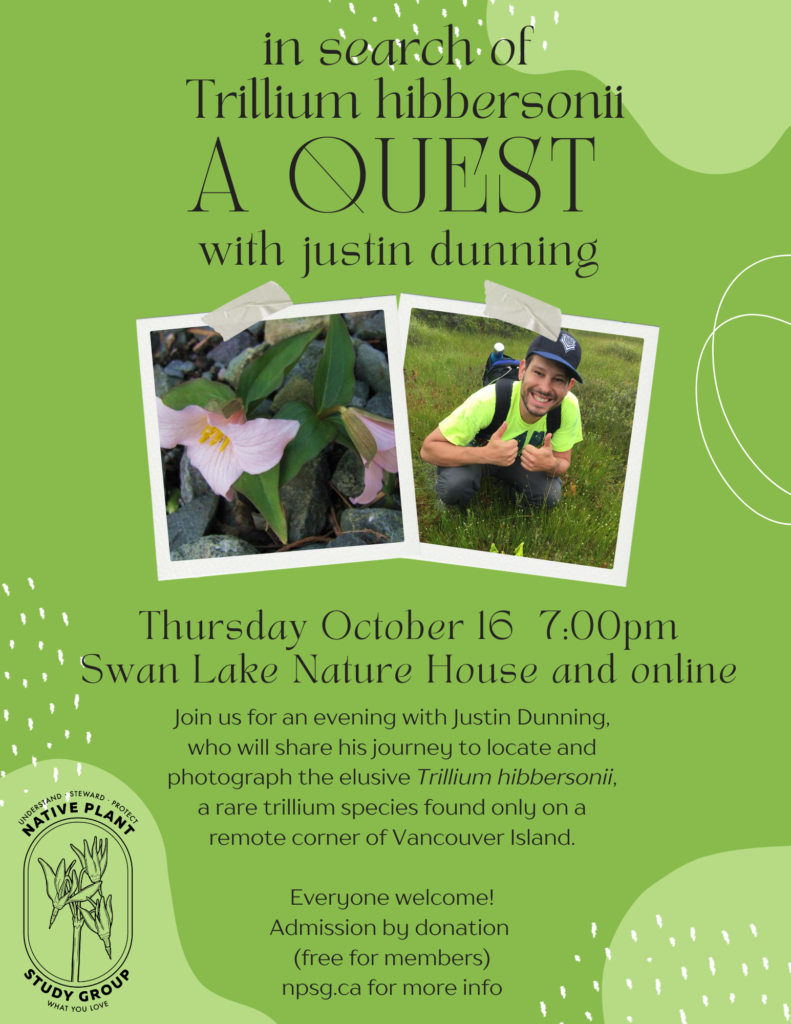 Join us for an evening with Justin Dunning, botany enthusiast and passionate explorer of rare native plants. Justin will share his journey to locate and photograph the elusive Trillium hibbersonii, a rare trillium species found only on a remote corner of Vancouver Island. Through vivid images and field stories, he’ll reveal the challenges and triumphs of tracking this botanical treasure, and why its conservation matters.